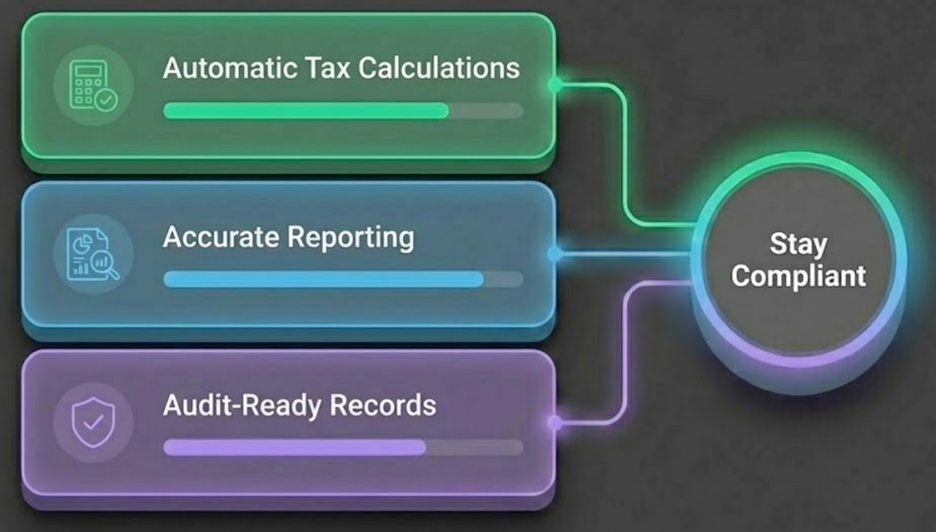 Automatic tax calculations, accurate reporting, and audit-ready records.